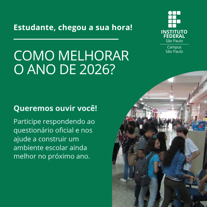 O IFSP está ouvindo seus estudantes da Educação Básica (cursos técnicos integrados) para planejar ações e melhorias para o ano de 2026. Para isso, foi disponibilizado um questionário oficial, que poderá ser respondido até o dia 29/11.